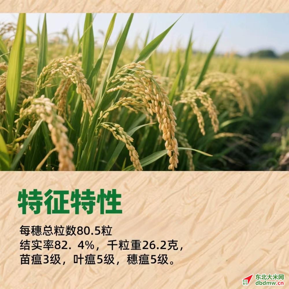 特征特性:在东北、西北晚熟稻区种植全生育期平均154.7天,比对照秋光晚熟3天。株高100厘米,分蘖力较强,株型松散,叶片披垂,散穗型,着粒较密,颖壳黄白,无芒。每穗总粒数80.5粒,结实率82.4%,千粒重26.2克。苗瘟3级,叶瘟5级,穗瘟5级。整精米率69.6%,垩白米率3.3%,垩白度0.2%,胶稠度88毫米,直链淀粉含量16.7%,米质达国标优质米1级标准。
